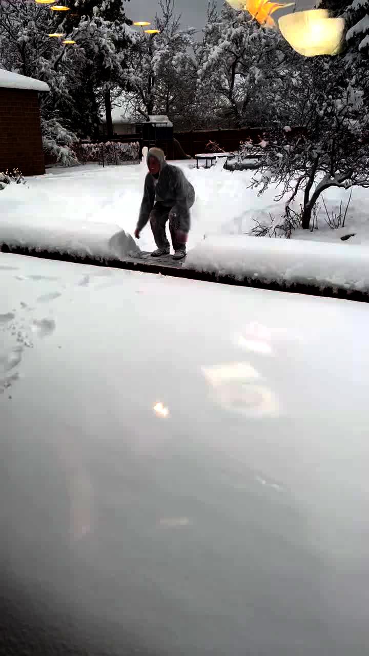 A man does a snow angel challenge with shorts in the front yard. He slips down the porch steps, and breaks the railing off a brick wall when he falls.
