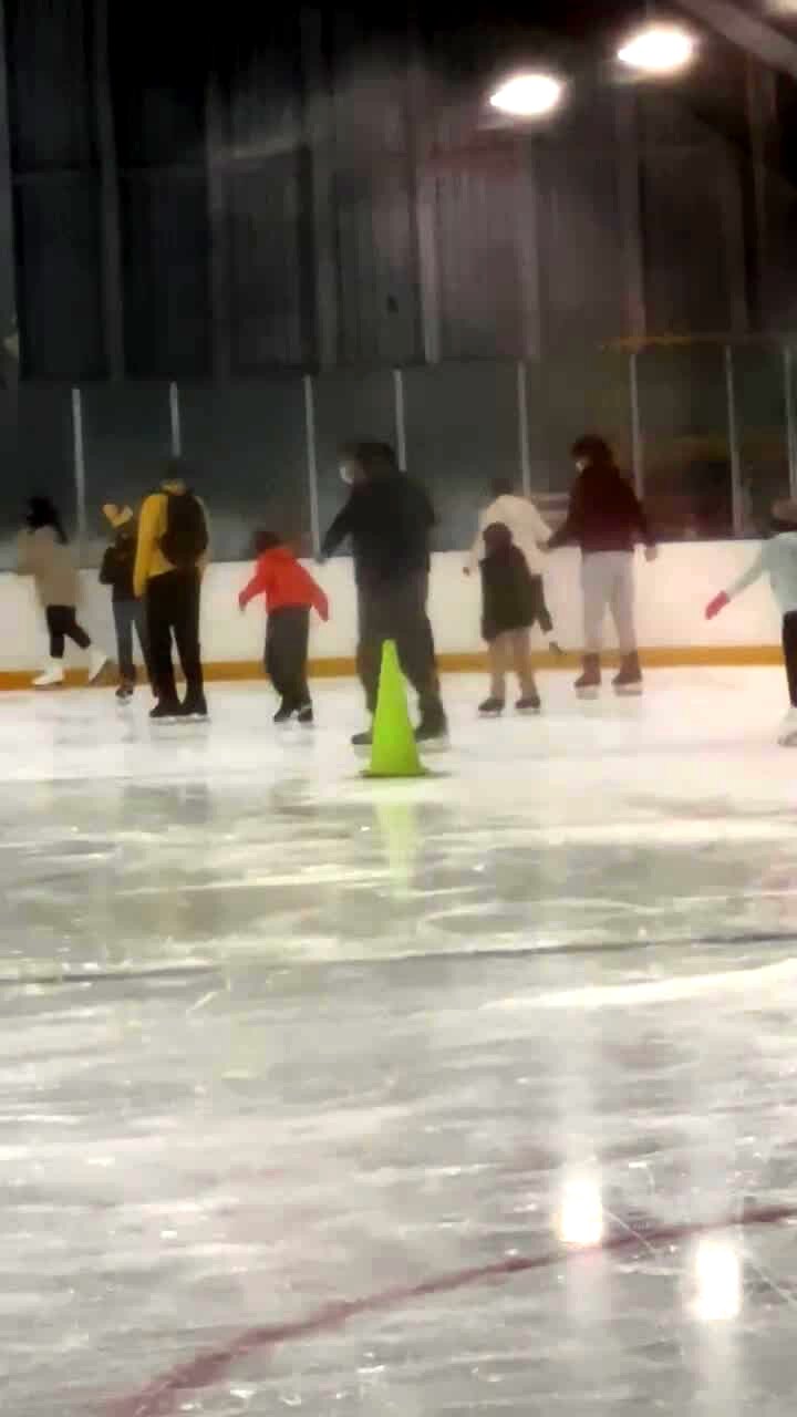 A man ice skates in a rink and the ice skate breaks off. He falls. Featured talent cleared ONLY (man who falls down on the ice).