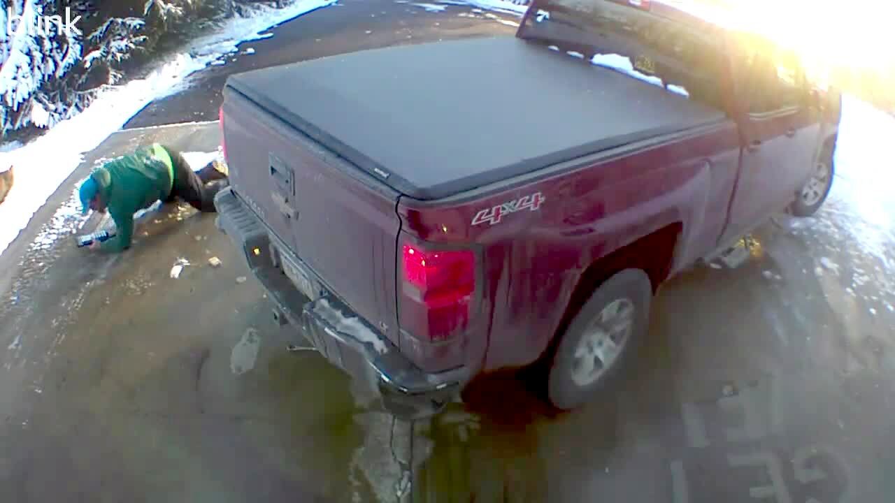 A man slips and falls on ice on a driveway, then farts. Security footage.