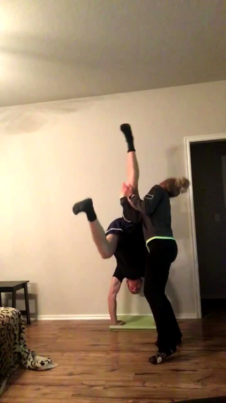 A woman tries to help a man do a handstand and he can't get his legs into the air and accidentally hits her in the face.