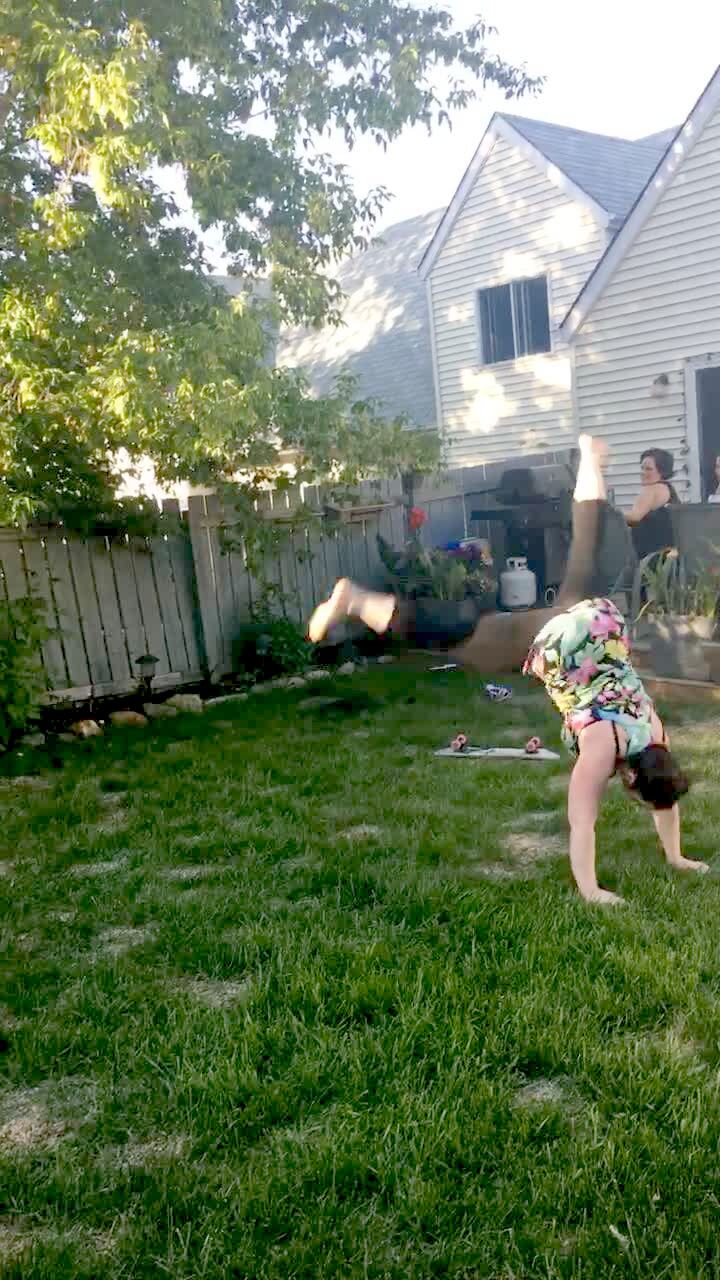 A woman does a cartwheel and then falls down in a back yard.