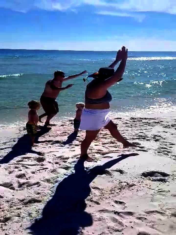 A woman does a cartwheel on a beach. She tries to regain her balance and knocks over a tot boy as she falls down.