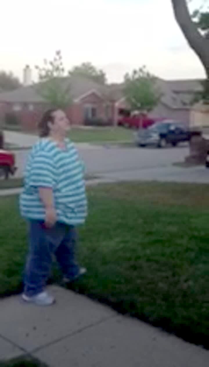 A young woman runs toward a man outside, and he lifts her over his head, attempting the lift from Dirty Dancing, then they both fall down.