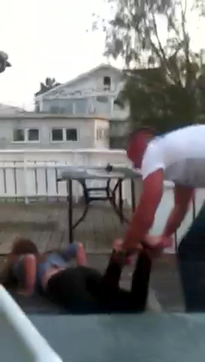 A woman tries to do a flip over her husband to show her friends, but he moves at the last minute and she falls on her face.