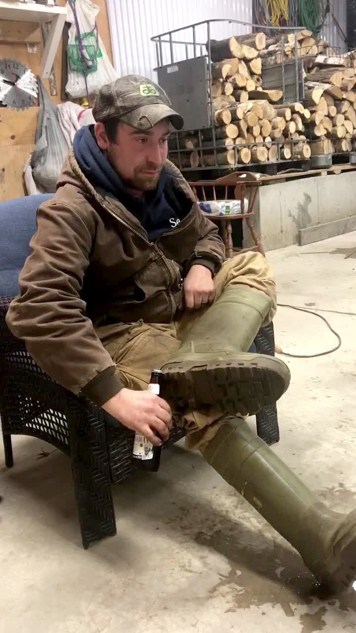 A man tries to open a beer bottle with his shoe, but he loses his grip on the bottle and it breaks on the floor.