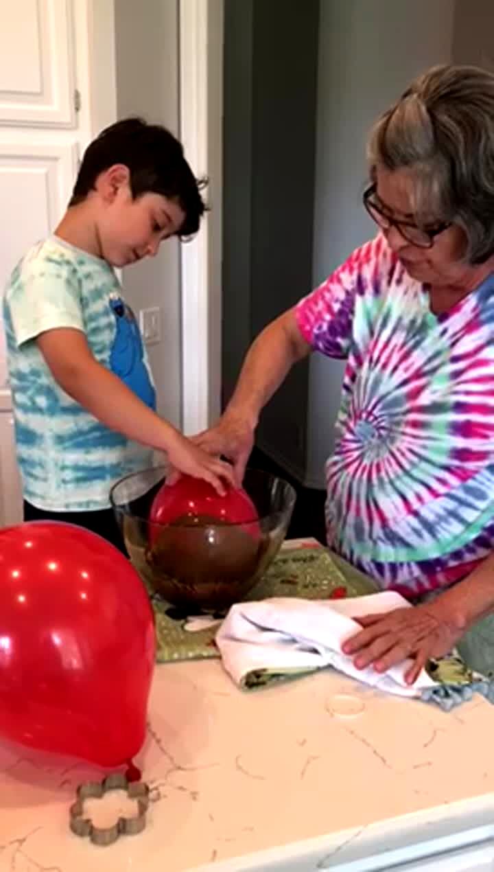 A woman and young boy cover a balloon in chocolate sauce, and the balloon pops and gets chocolate all over the woman's face.