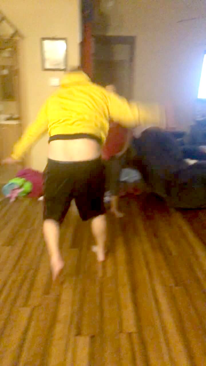 A man breaks a chandelier in the living room when he kicks it with his foot as he does cartwheels.