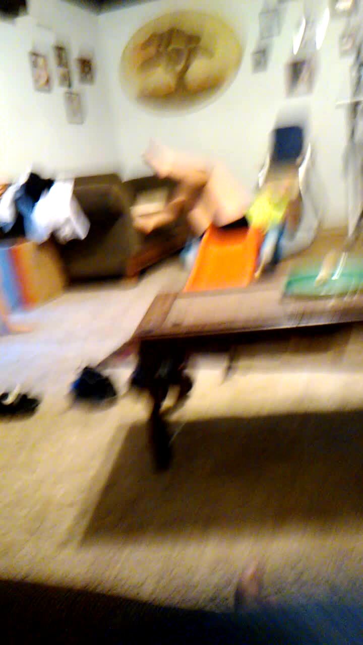 An off-camera father calls his young son out to the garage and tells him to hustle and the boy runs into a piece of tape stretched across the door and it wraps around his head.