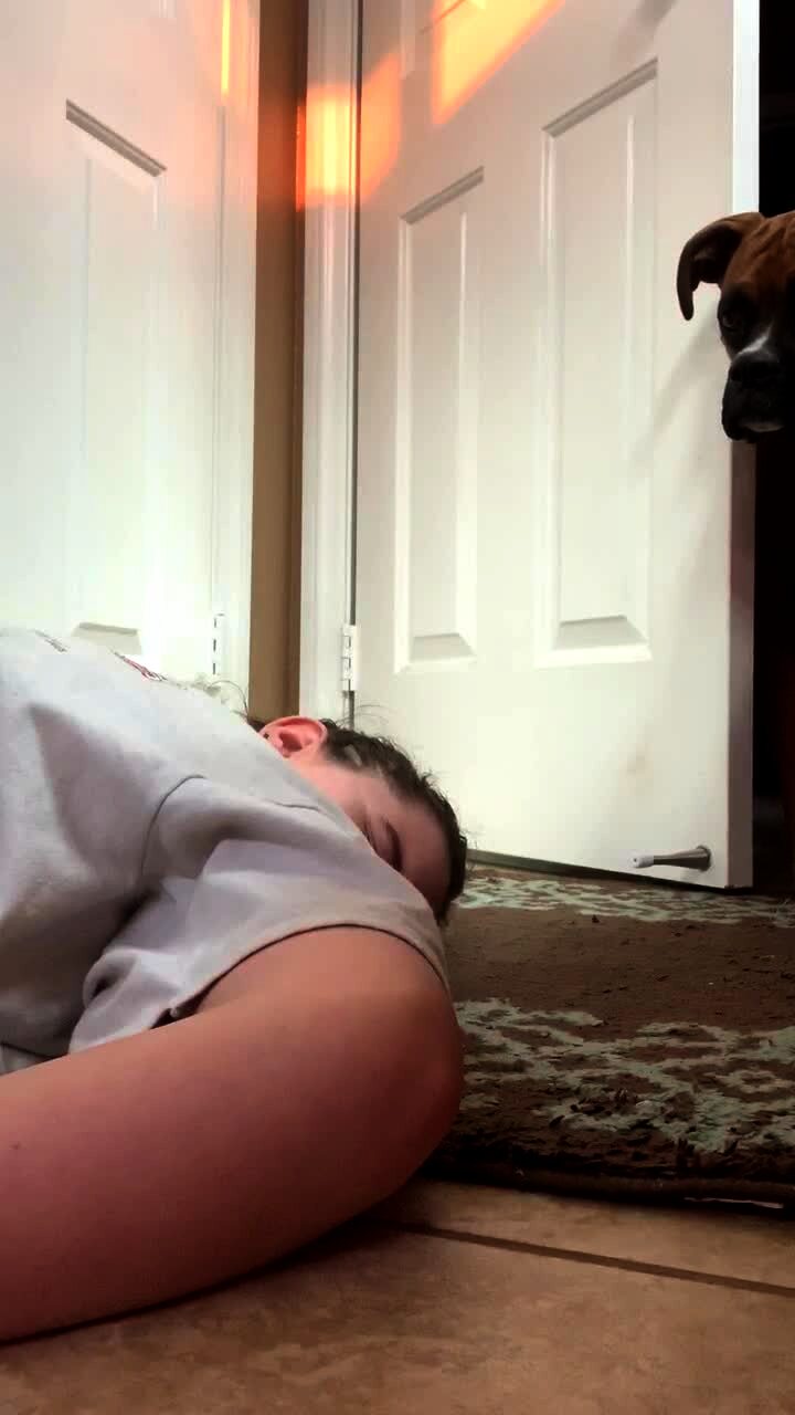 A woman lays face-down on the floor in a bedroom. At :26, a Boxer dog enters the room and whines. It repeatedly walks in and out of the room, then it sniffs her and scratches her face with its paw. She gets up suddenly and laughs.