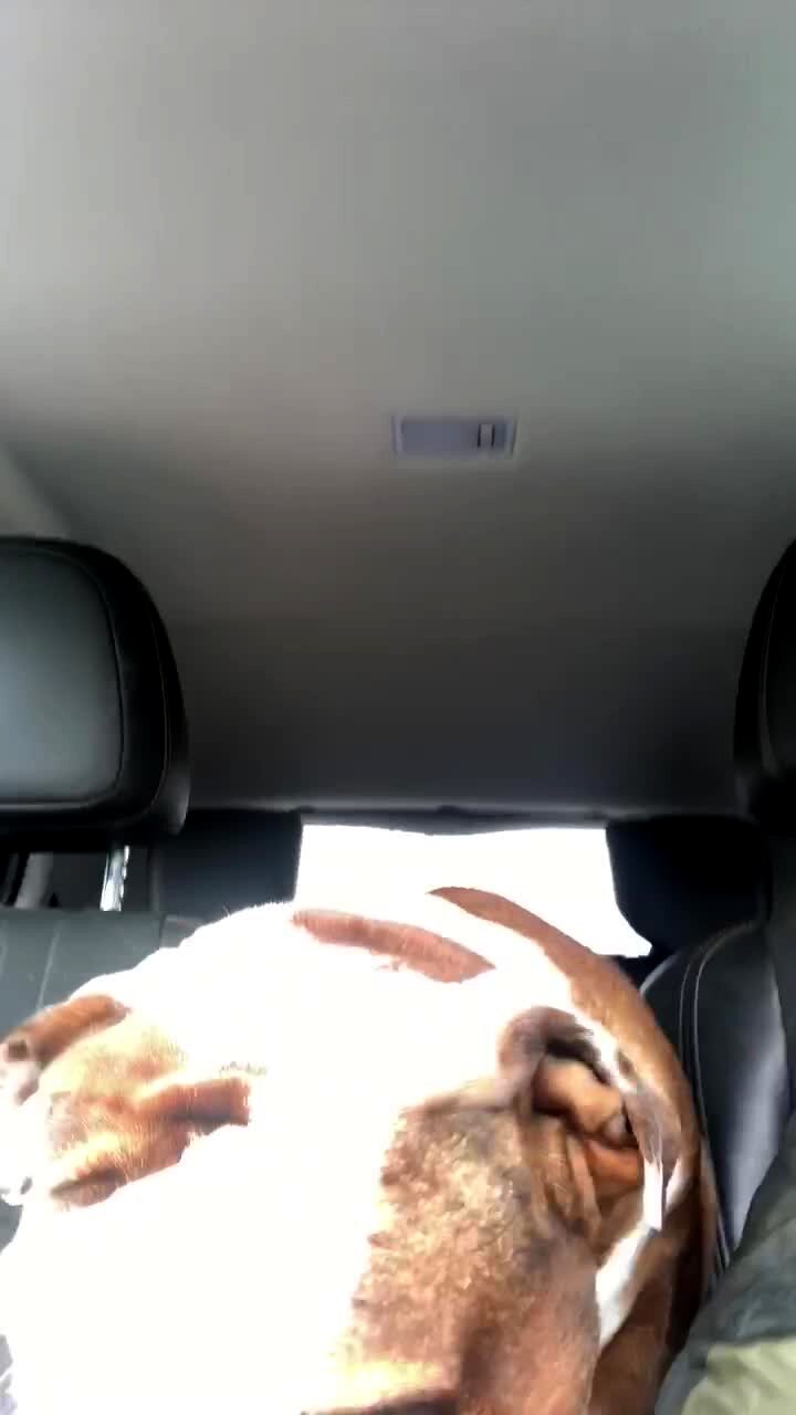A bulldog dog whines in a strange voice while a woman asks where they're going in the car.