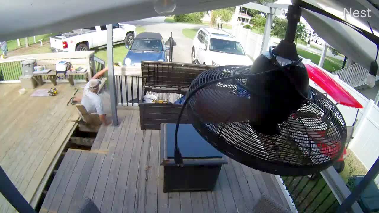 A man sits on a porch swing. When the swing suddenly breaks and he falls, he screams yells. Security footage.