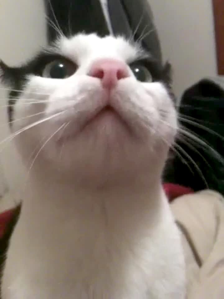 A man lays on a bed, a cat sits on the man's back. The man moves his head and the cat looks at himself in phone screen. This happens several times, then the cat pukes on the mans shoulder. The man just says "gross."