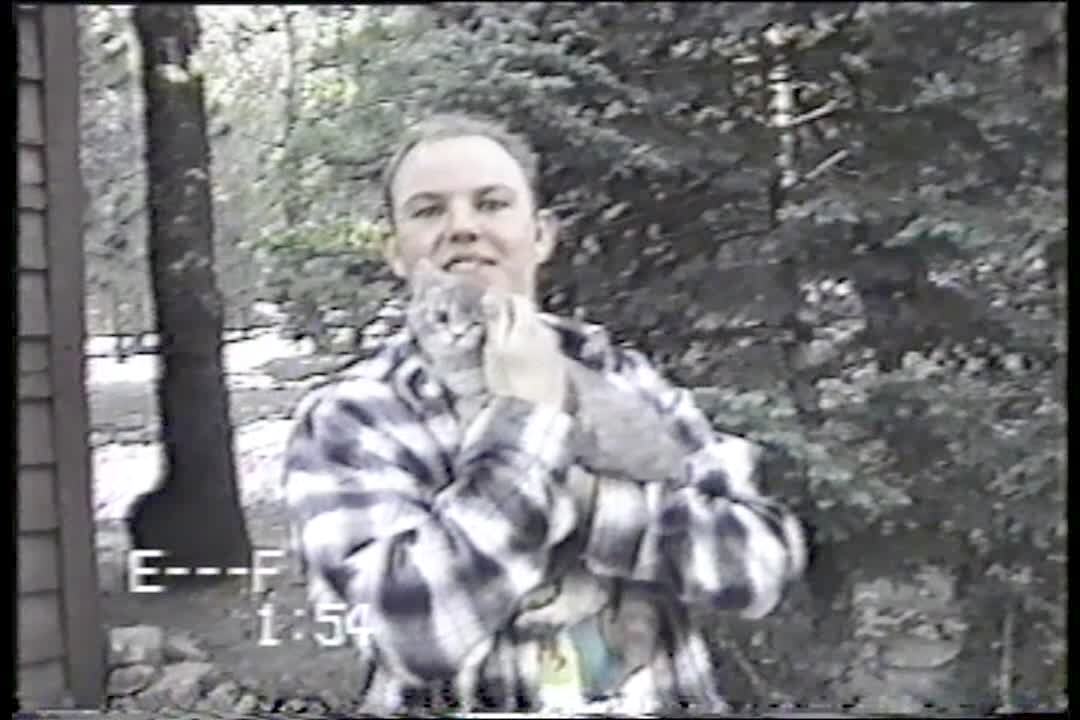 Cat Dancer. Man has cat crawl onto his head, they dance.