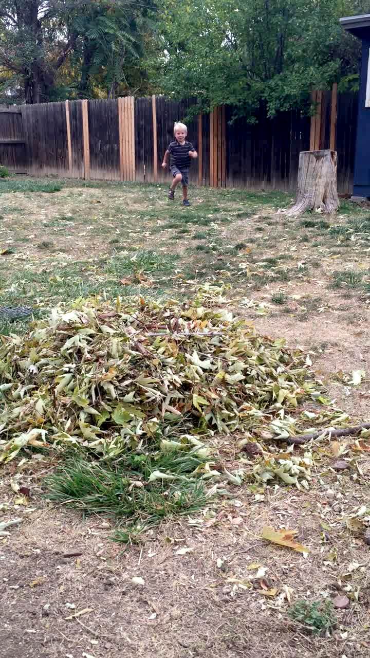 A tot boy runs to jump into a pile of leaves and, at the last second, is run over by a dog outdoors.