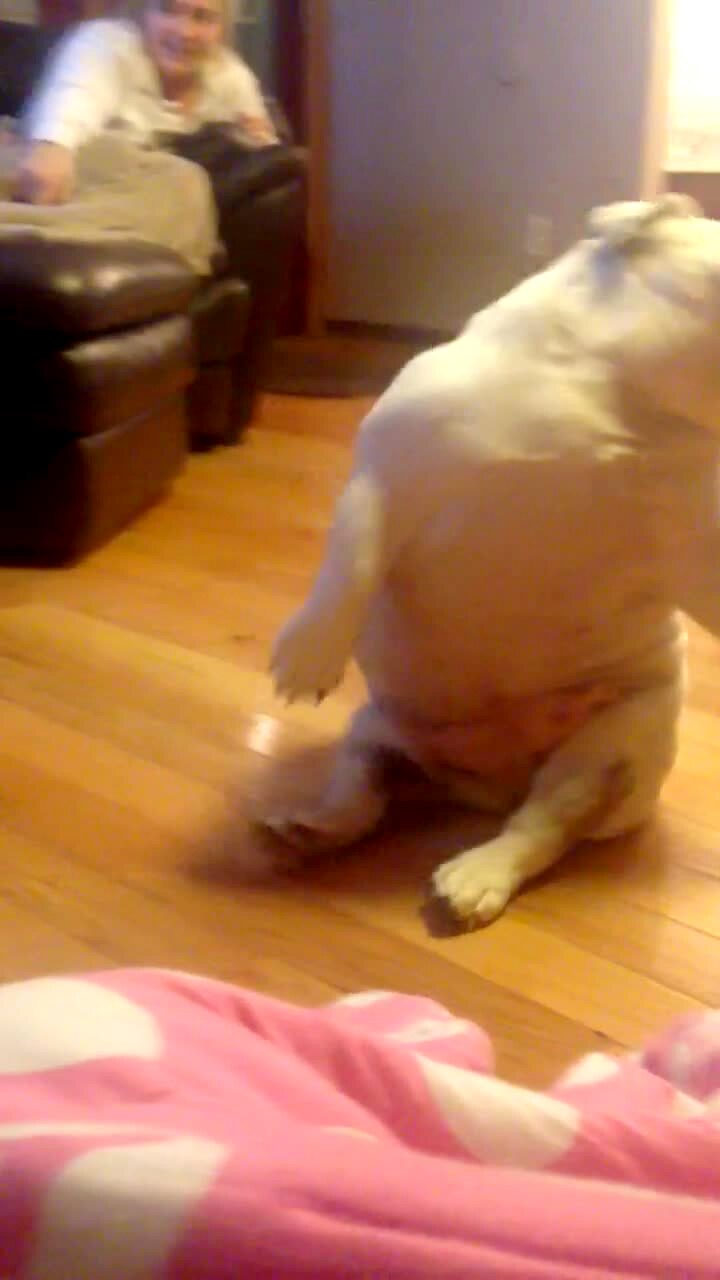 Bulldog scratches butt on carpet, looks like he's dancing.