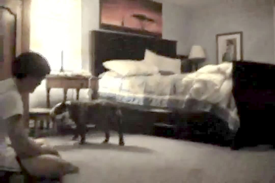 Bulldog in a bedroom jumps up and down on the ground when man taps his finger on the floor. Long for edit. Dog