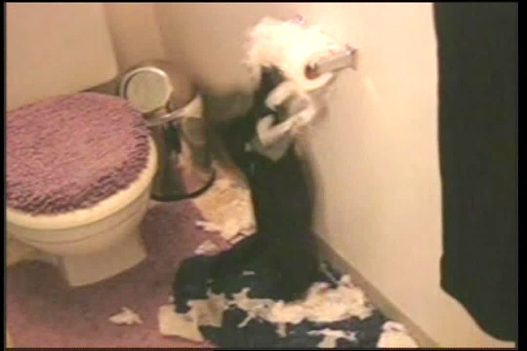Cat hangs from toilet paper roll. He chews it and makes a mess. Attacking the toilet paper. Bathroom