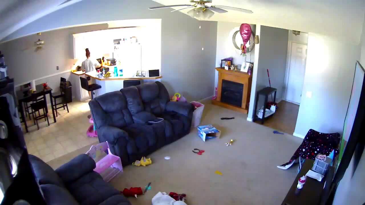 A woman in a living room runs and jumps over a toy bench and trips and falls and lands hard on the floor. Security footage.