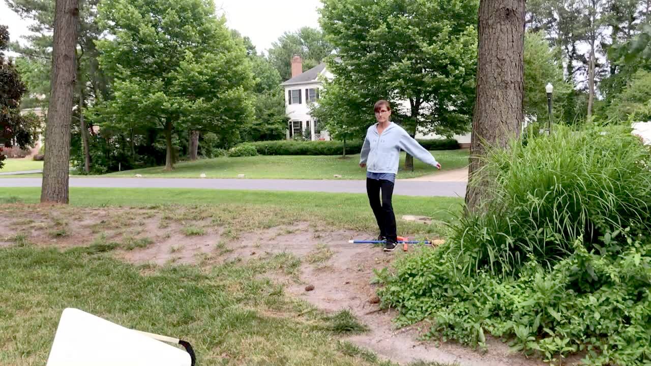 A woman pulls twine off a small tree in a yard and falls backwards and flips and falls off the landscaping wall. Security camera.