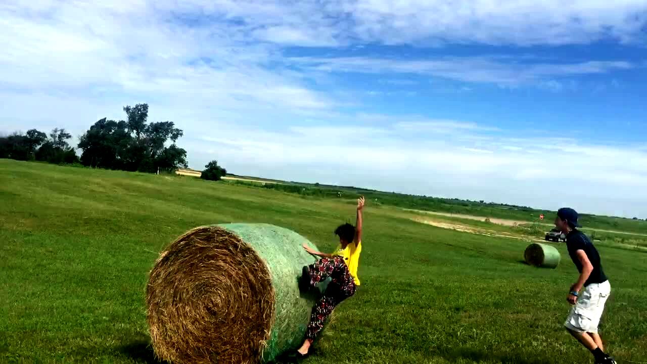 Two young men take turns running on a rolling bale of hay outdoors and both of them fall.