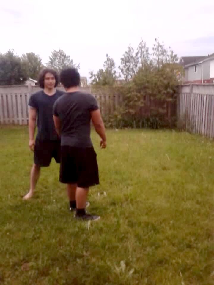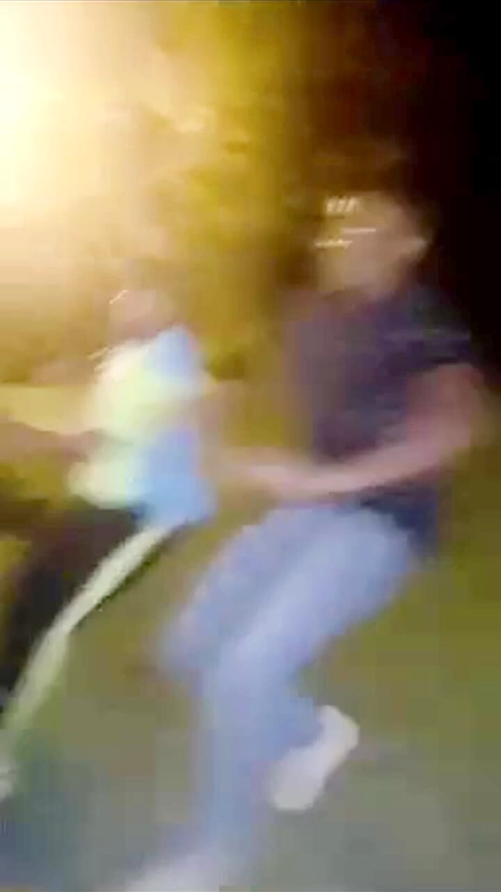 Two men race in a yard at night towards the side of a house and one of them slips and slides and crashes and breaks through the siding under the house and the woman with the camera curses.