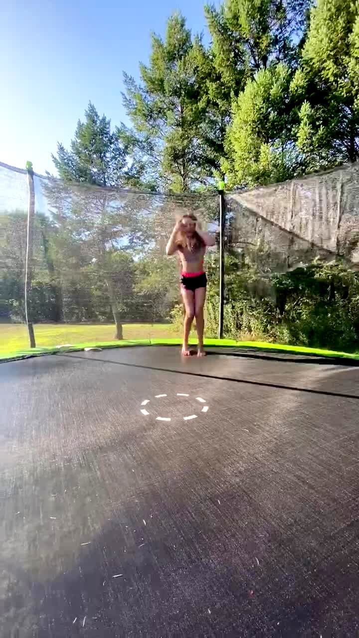 A young girl on a trampoline asks her friend if she has enough room to do a trick and her friend says "yeah". She does a roundoff and knocks her friend out of the trampoline in a yard.