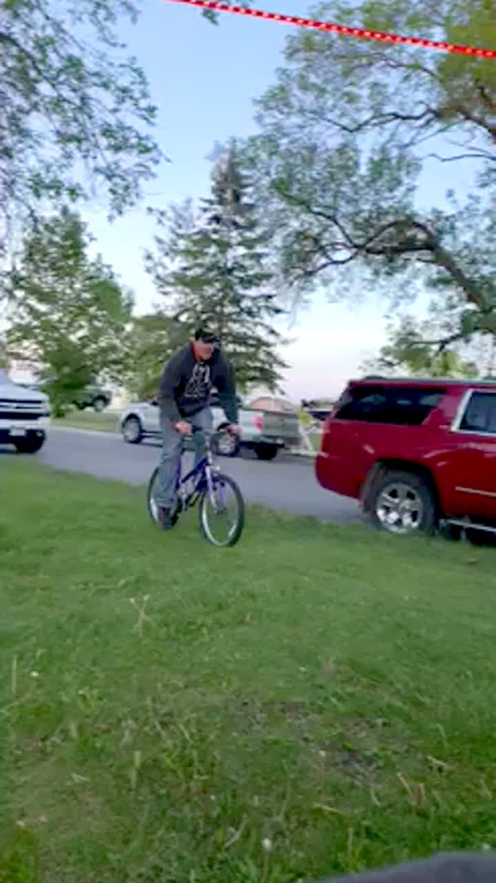 A senior woman tries to ride an electric scooter in a yard and can't. Around 0:40 she trips and stumbles across the yard before she falls.
