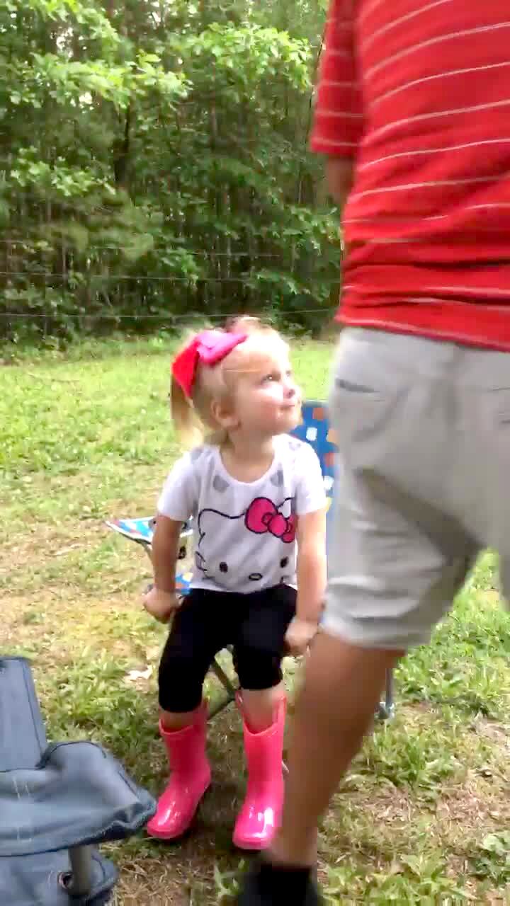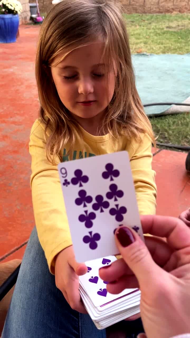 A young girl tells her mother to pick a card from a deck of cards and put it on the top in a yard. Then her daughter holds up the card and yells "magic" when the woman says that it was her card.