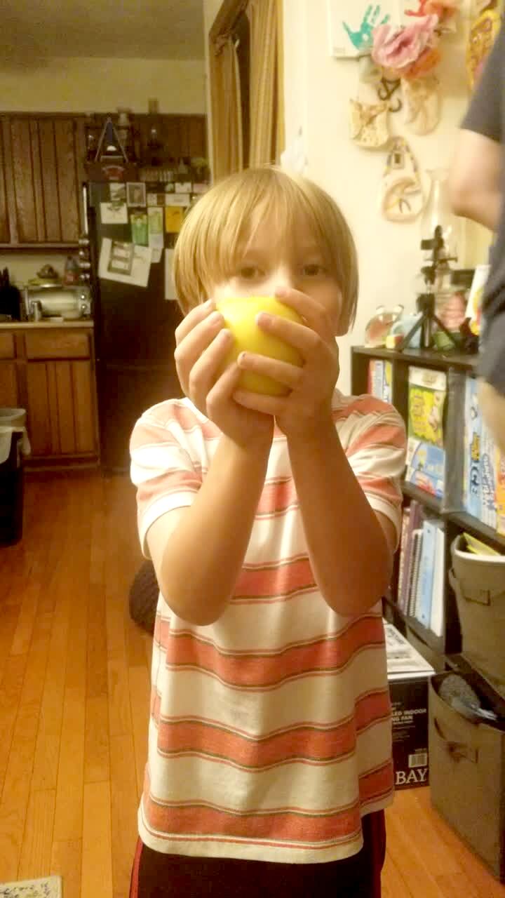 A young boy holds an apple and pretends it levitates for a magic trick in the kitchen, then the apple moves to reveal it's attached to a fork the boy holds in his mouth.