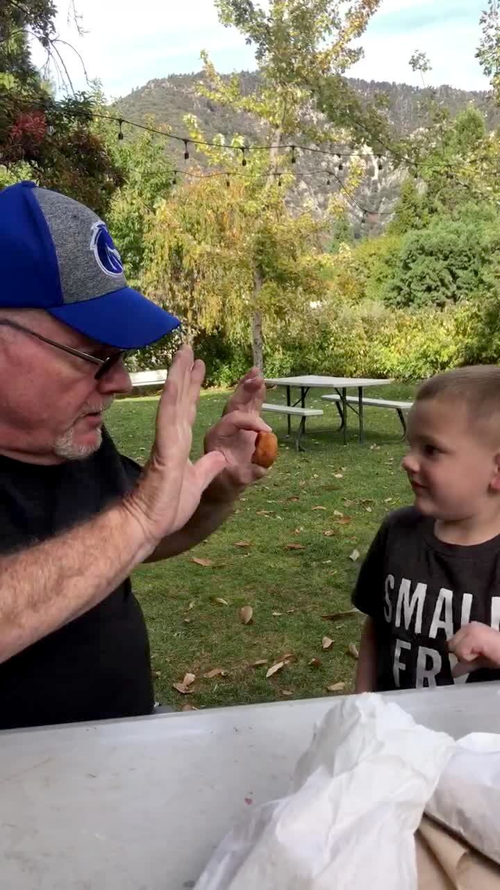 A man holds a small doughnut and tells his young grandson he will make it disappear, then puts it in his mouth and the boy says, "Wow".