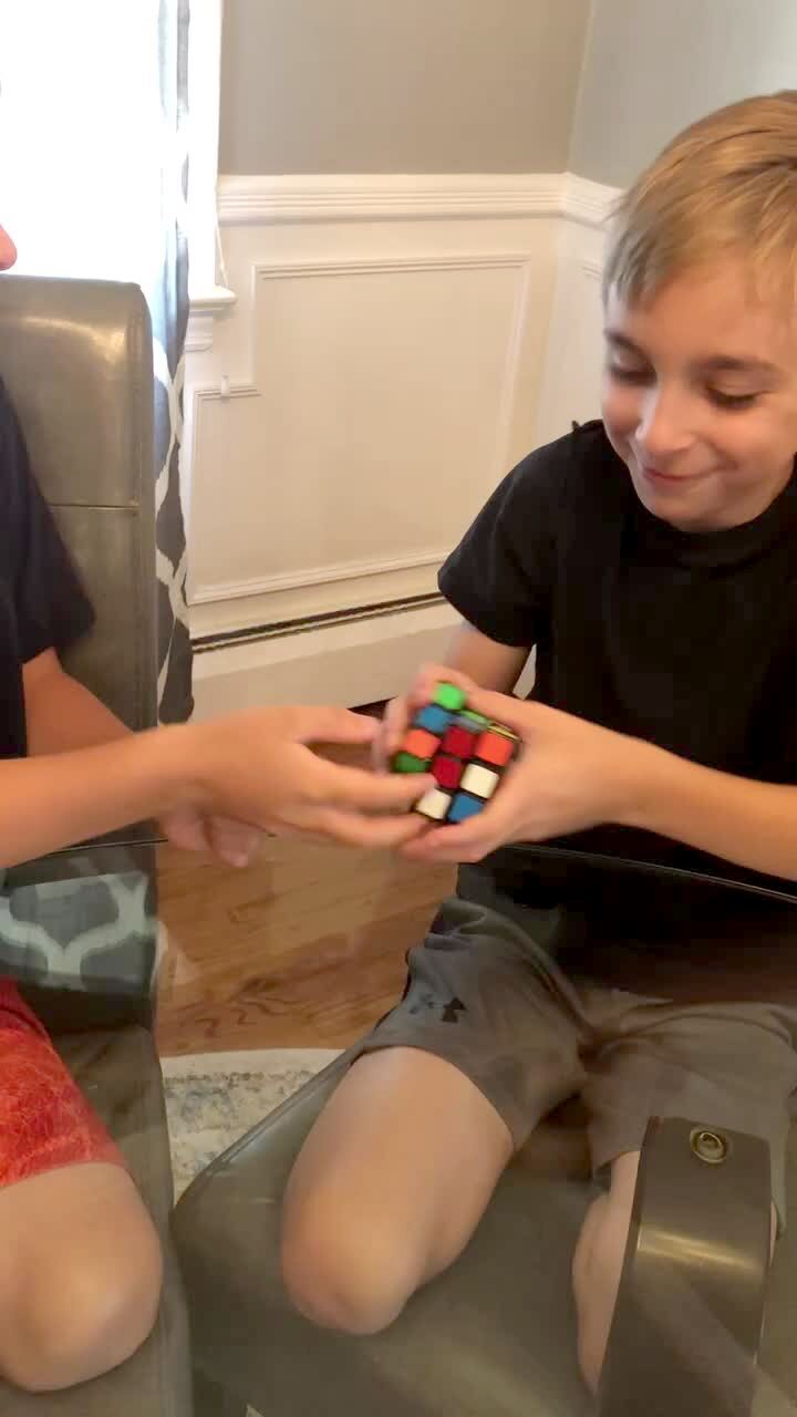 Three young boys take turns on an incomplete Rubik's cube. They then pass it to another young boy, who puts it in a bag, snaps his fingers, and pulls out two complete Rubik's cubes. He then crumples the bag and throws it behind him.