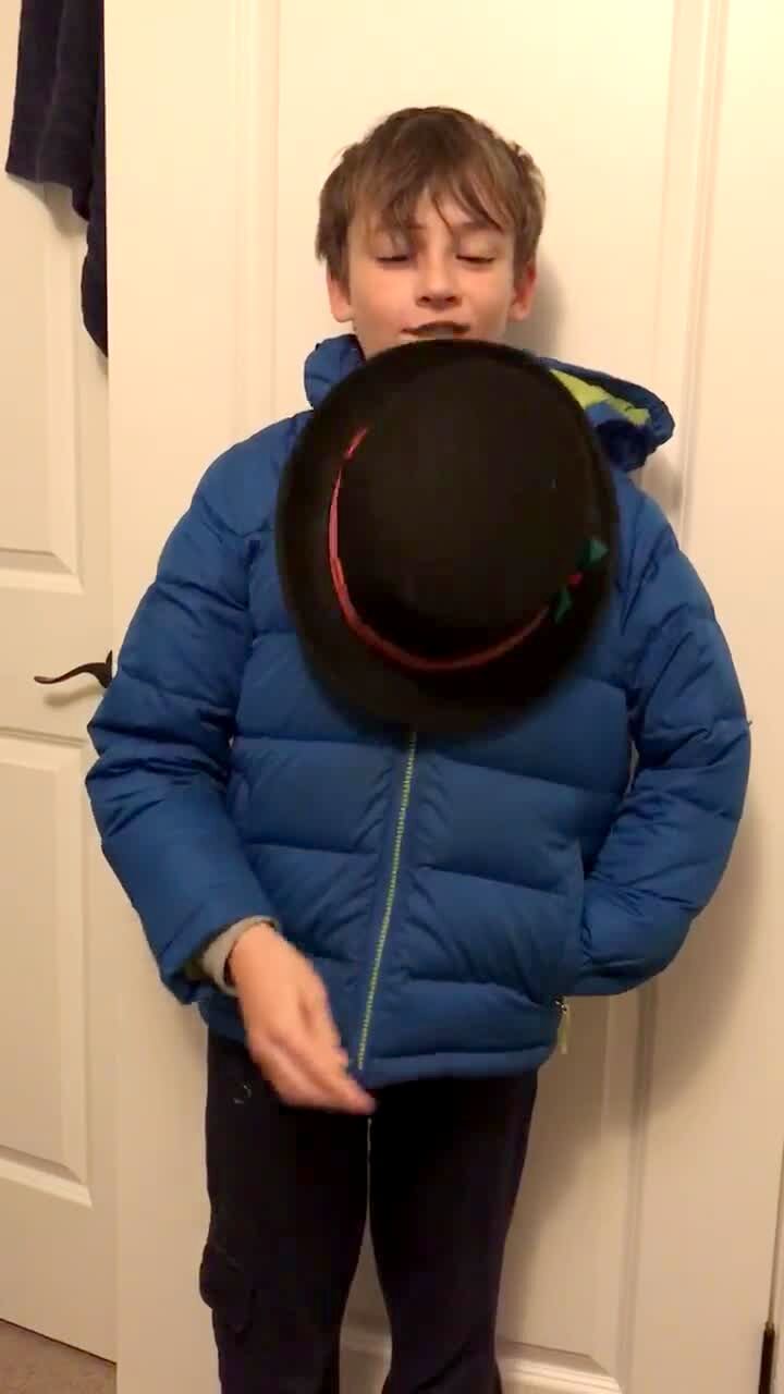 A young boy pulls a top hat off of his head and makes it appear to float in front of his body.