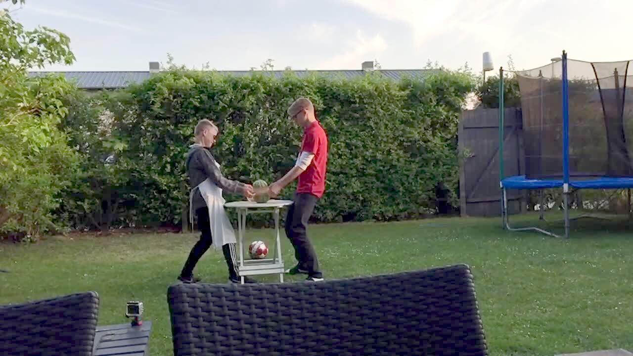 Boy punches punching bag on back porch, bag bounces back and hits tot girl in face, knocks her off stool.