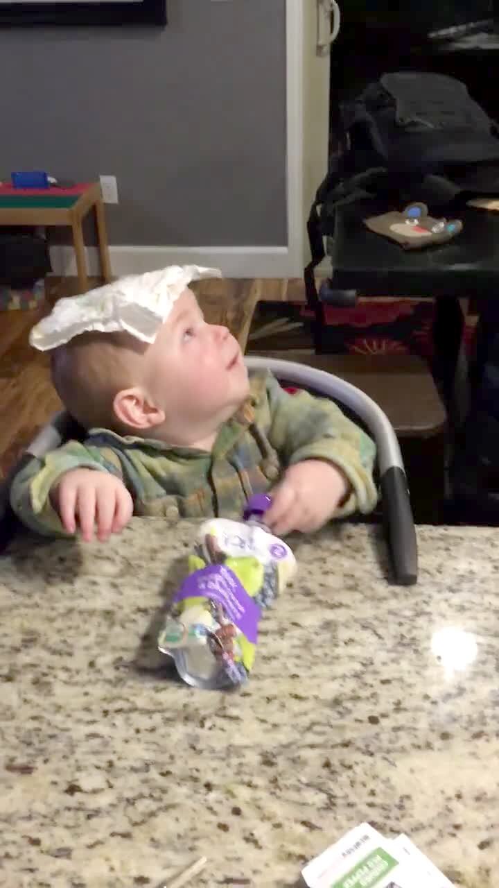A young girl gives her Golden Retriever dog a piece of bacon as he wears a dinosaur mask in the house, and when the dog chews the mouth of the mask moves.