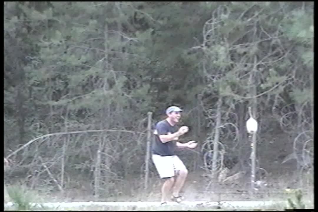 Man tries to use a water balloon sling shot, but it backfires and he shoots the balloon at himself. Summer.