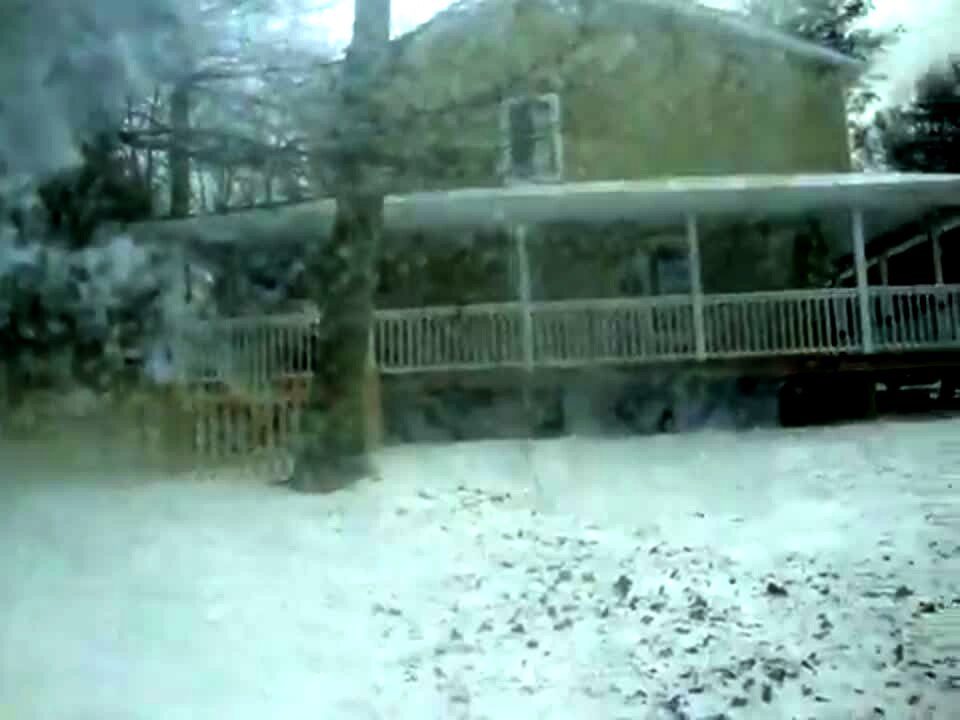 Snow and slush falls off the roof and hits woman on the head while she walked off the porch steps. Security camera footage.