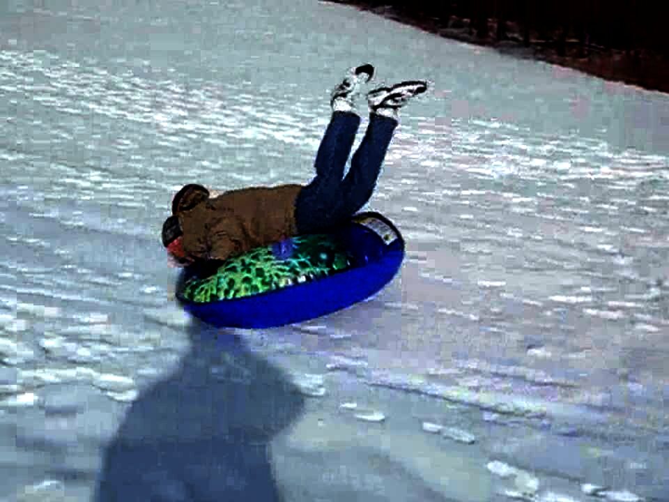 A man sleds down a hill, and he hits a bump and jumps up to run further down before he falls.