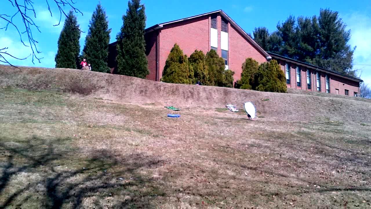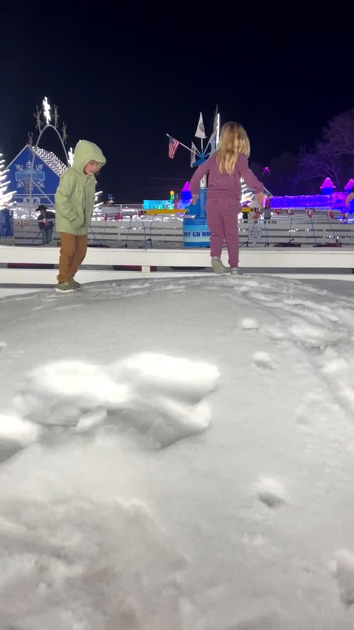 A young boy tries to slide down a snowy hill on his stomach but he flips over onto his back. Featured talent cleared only (young boy, young girl and their mother)