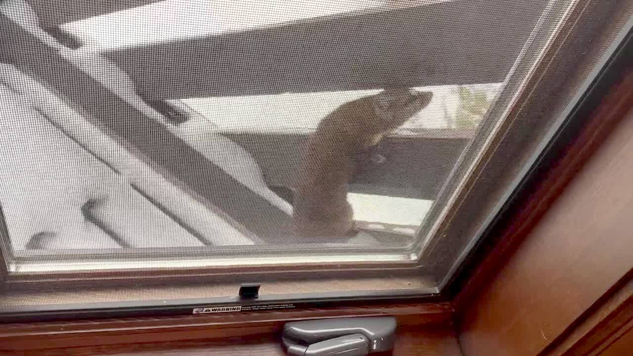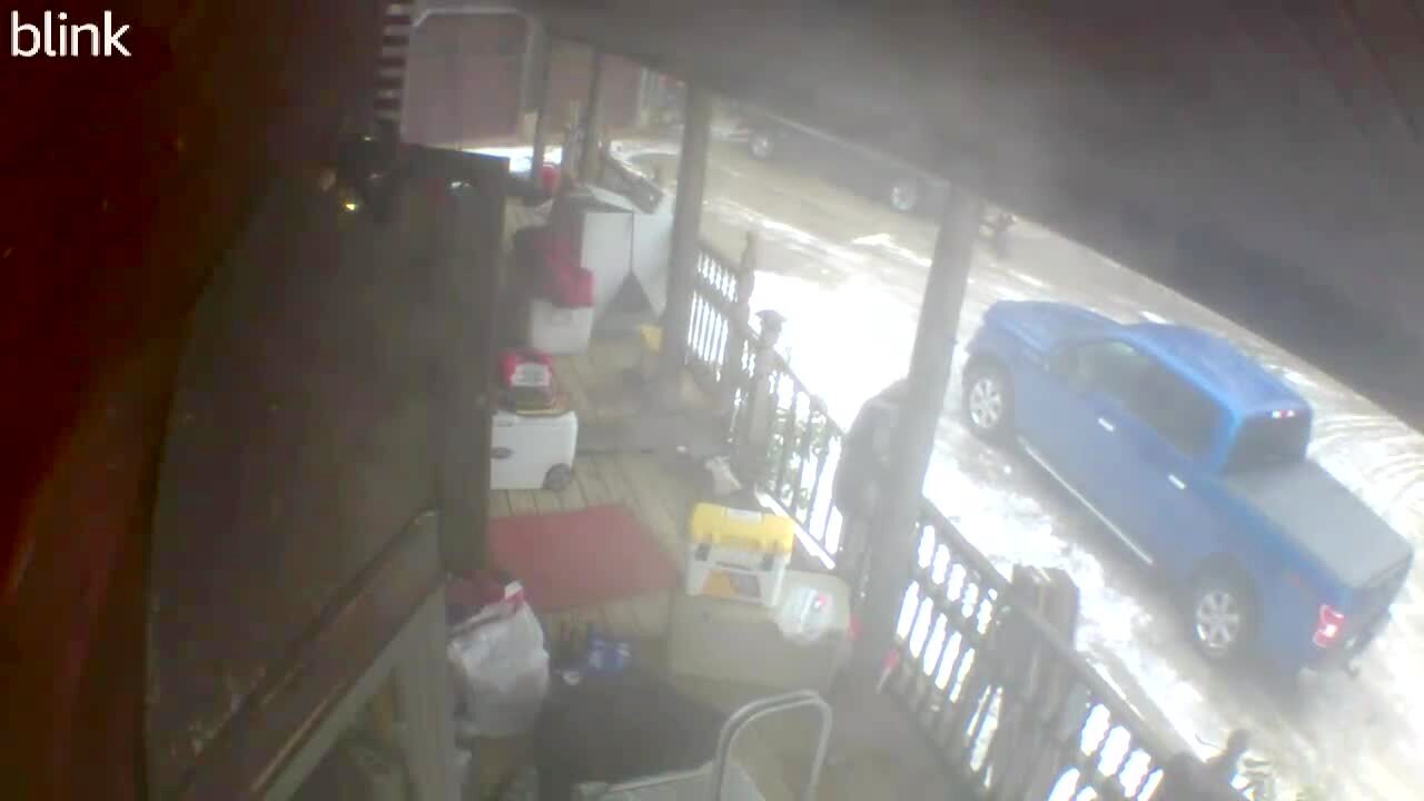 A man struggles to catch a snowflake and hits his chin on the truck in the driveway. Security footage.