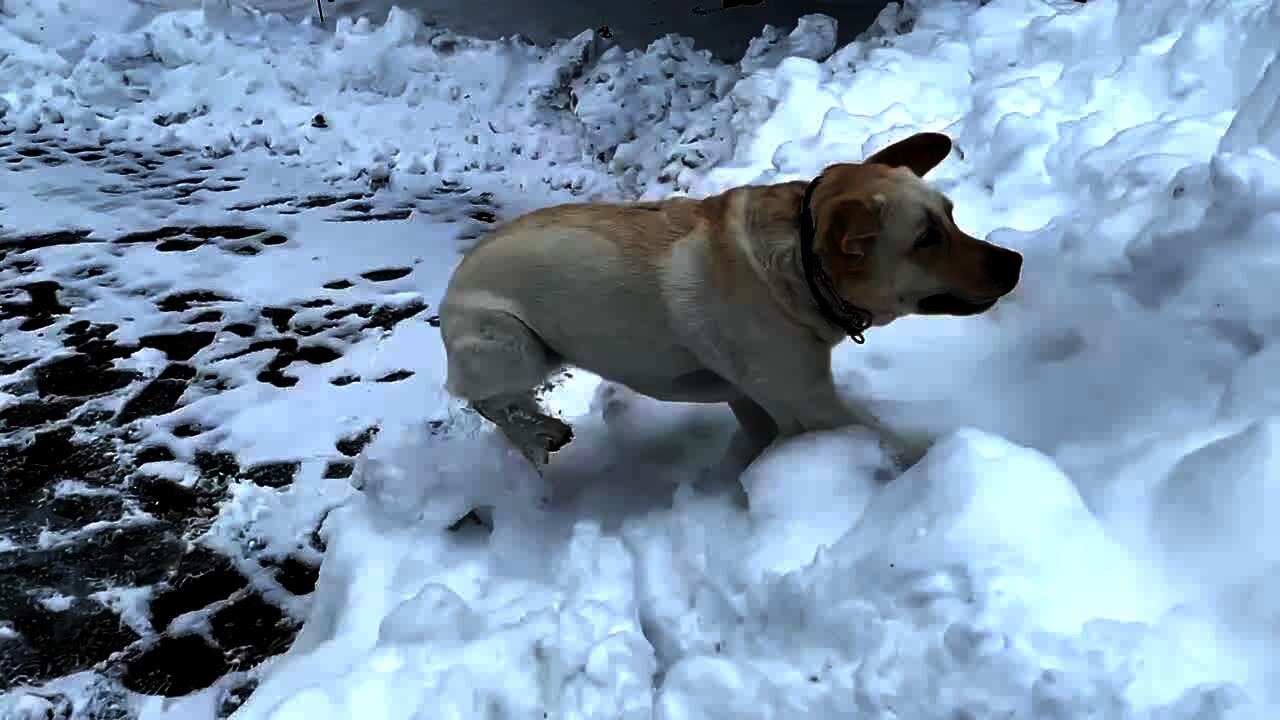 A black Labrador retriever runs through snow in a yard to attack a yellow Labrador retriever dog, but he slips and falls down a flight of stairs.