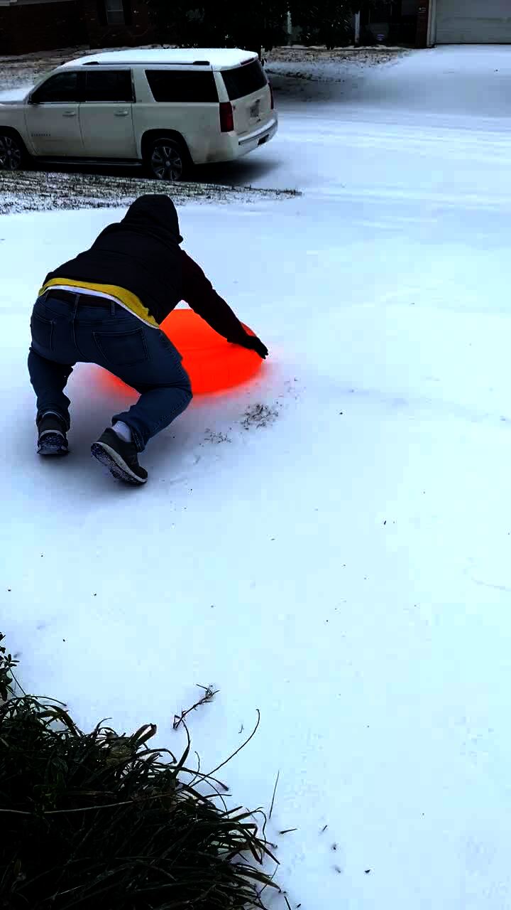 A young boy slides down a snowy hill on a sled and goes right into an igloo in a backyard.
