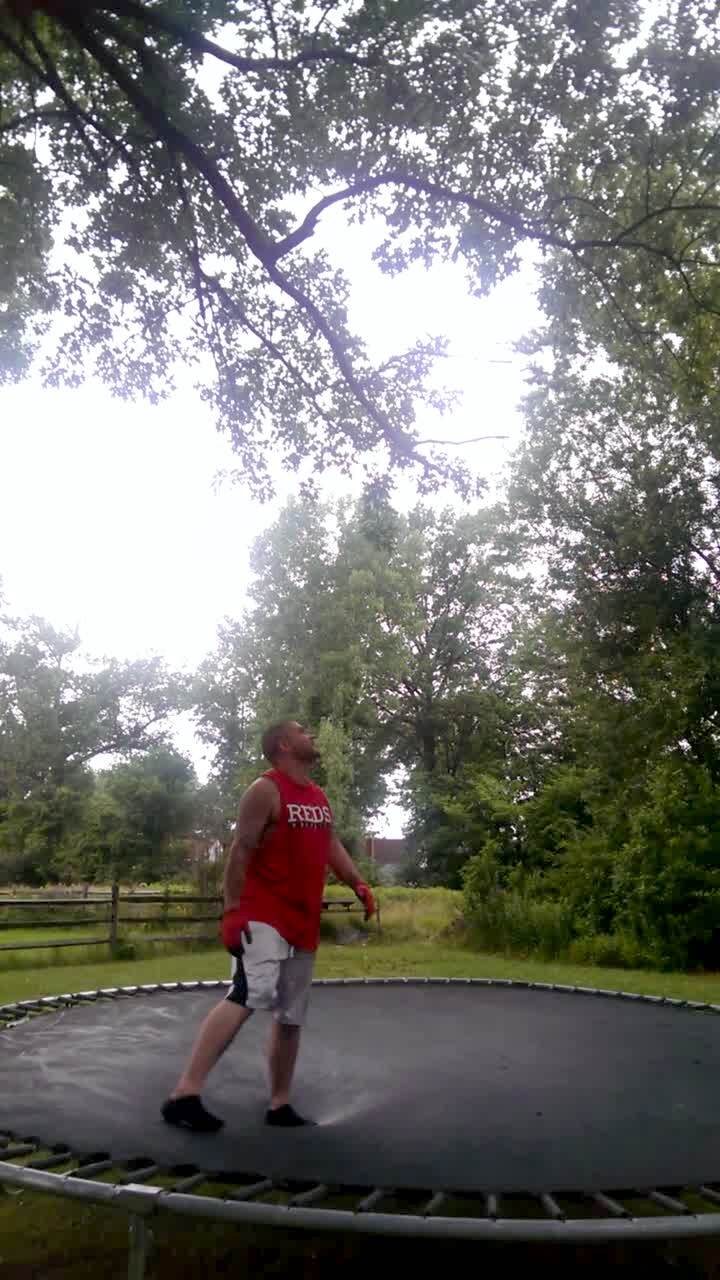 A man jumps on a trampoline outdoors and grabs a tree branch above him but when he pulls it down, it snaps off and he falls off the trampoline.