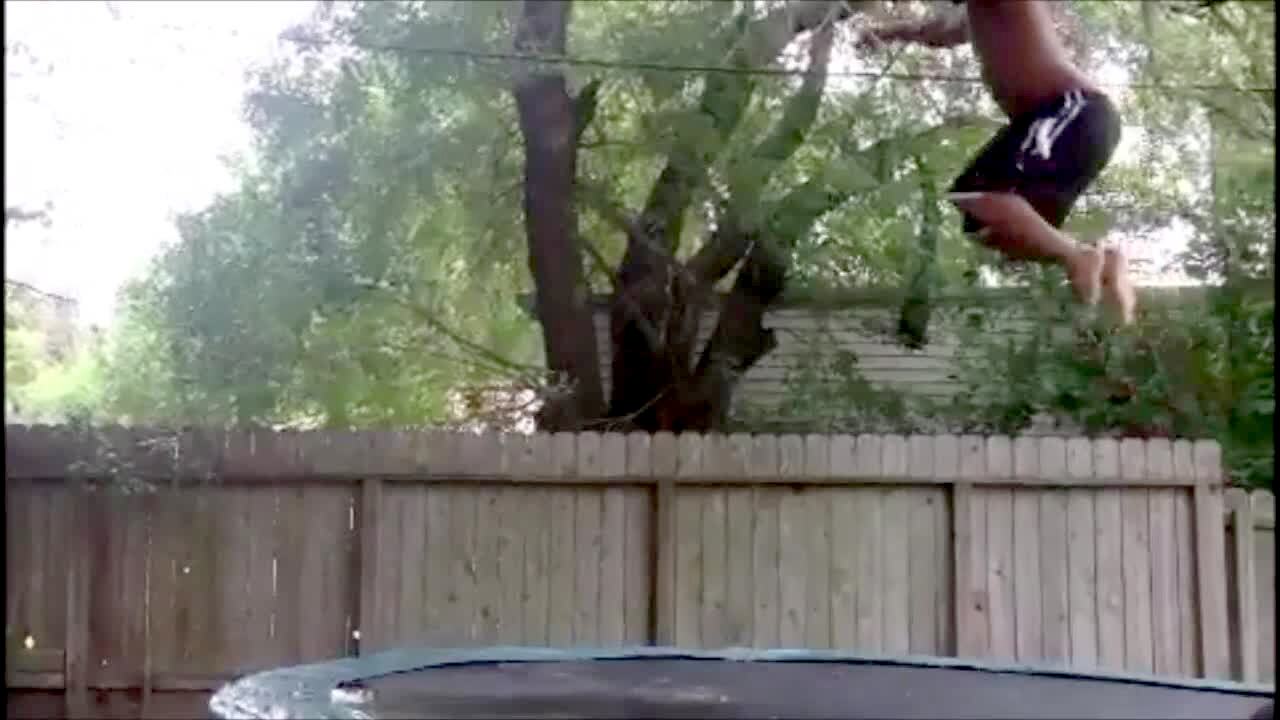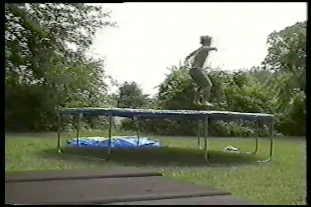 A man jumps on a trampoline in the yard outdoors and does a back flip and the trampoline breaks when he lands and he falls on the ground.