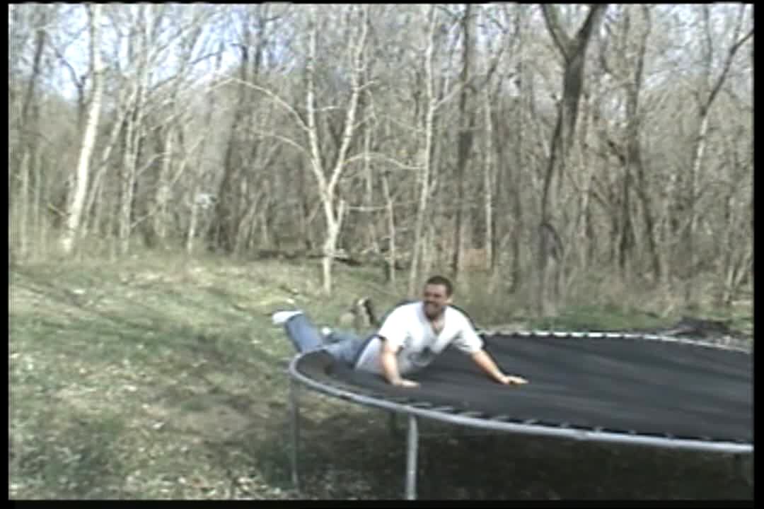 Man falls down while trying to get off a trampoline. He jumps onto the springs and they break, flying off everywhere.