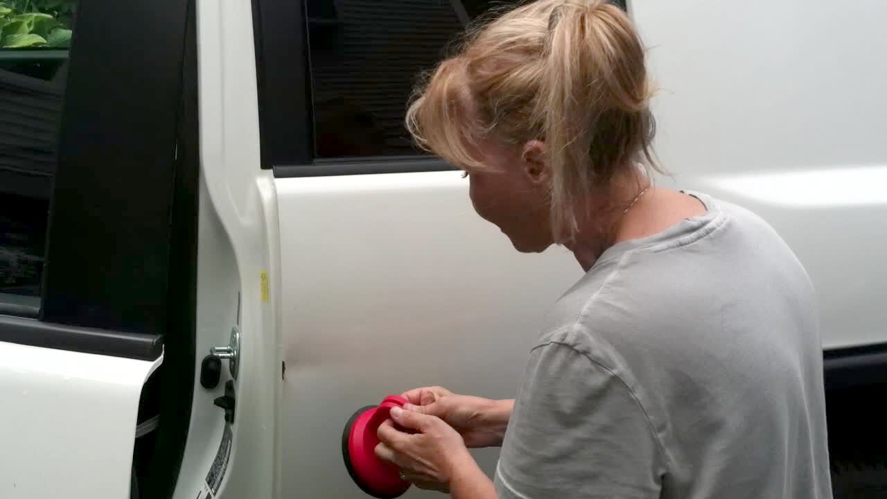 A woman shows how to use a dent remover and falls over. Action at :30.