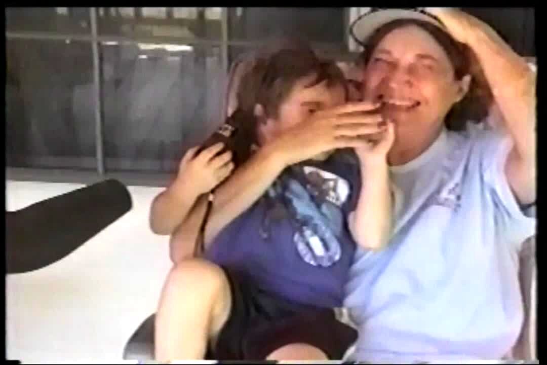A woman struggles to take a lollipop out of her mouth as it's stuck to her dentures. The woman behind the camera laughs hard.