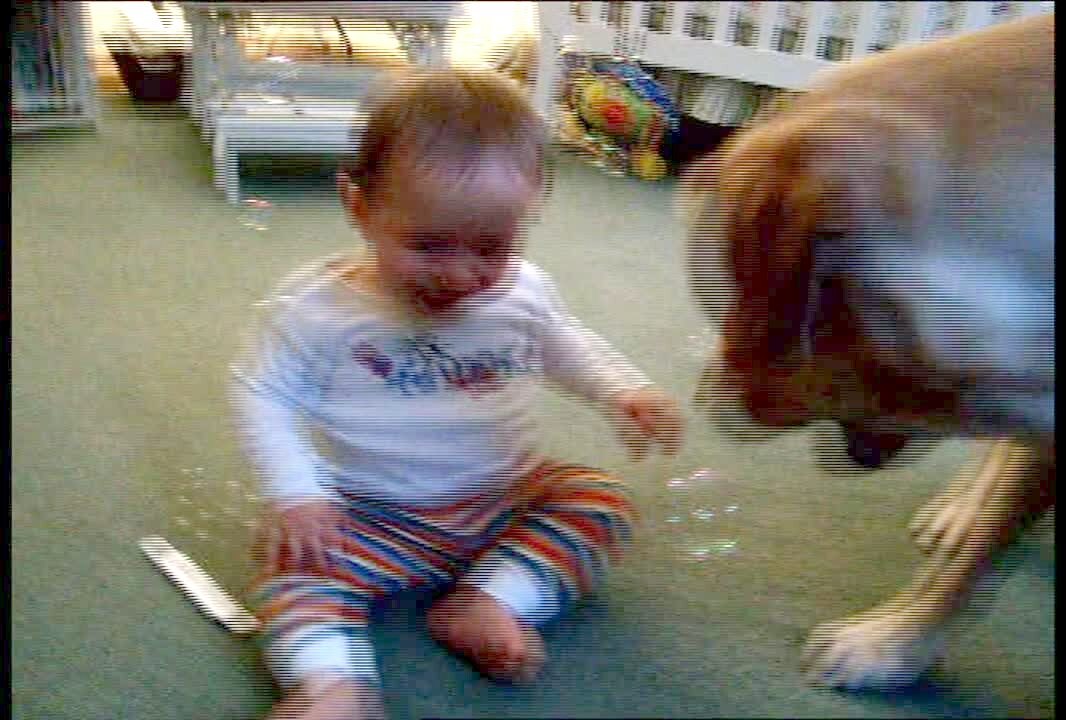 Tot boy kisses large dog on floor in house. Dog pushes him over with its paw