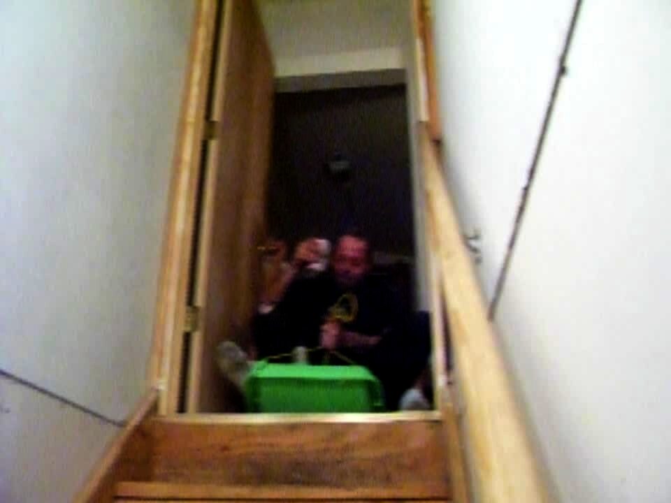A man does pushups on the floor and then a dog barks from off camera and then drags their butt along the floor across the view of the camera.