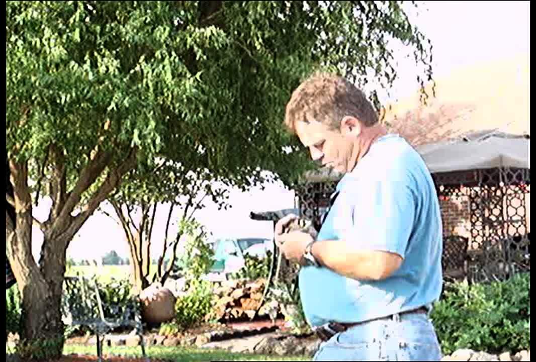 A dog yanks away from its owner, as she holds him on a leash after he sees another dog. The woman gets pulled onto a bush as she falls in a yard. Security footage.