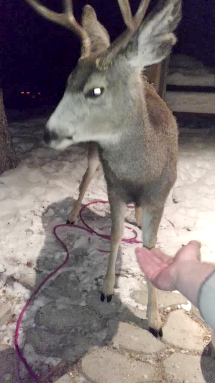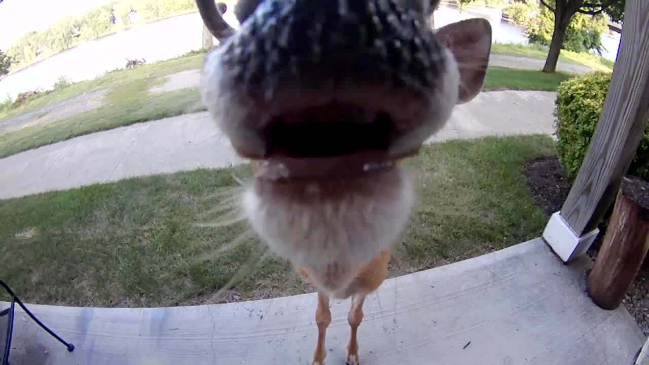 A deer walks up to a man's camera outdoors and smells/ licks the lens in slow motion.